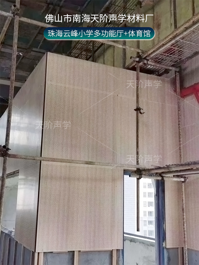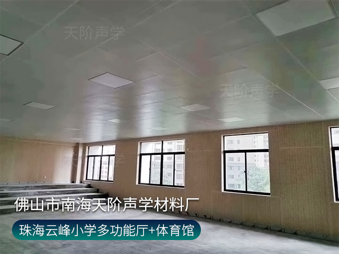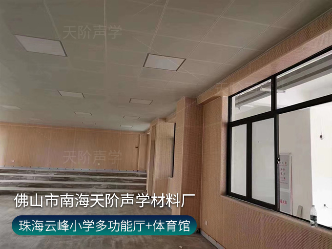 珠海云峰小學多功能廳,墻面使用穿孔吸音板,基材選用不燃堅硬的玻鎂基材,飾面選用溫和的色調。整齊穿孔吸音板,吸音效果顯著,能吸收活動期間的噪音,回聲。