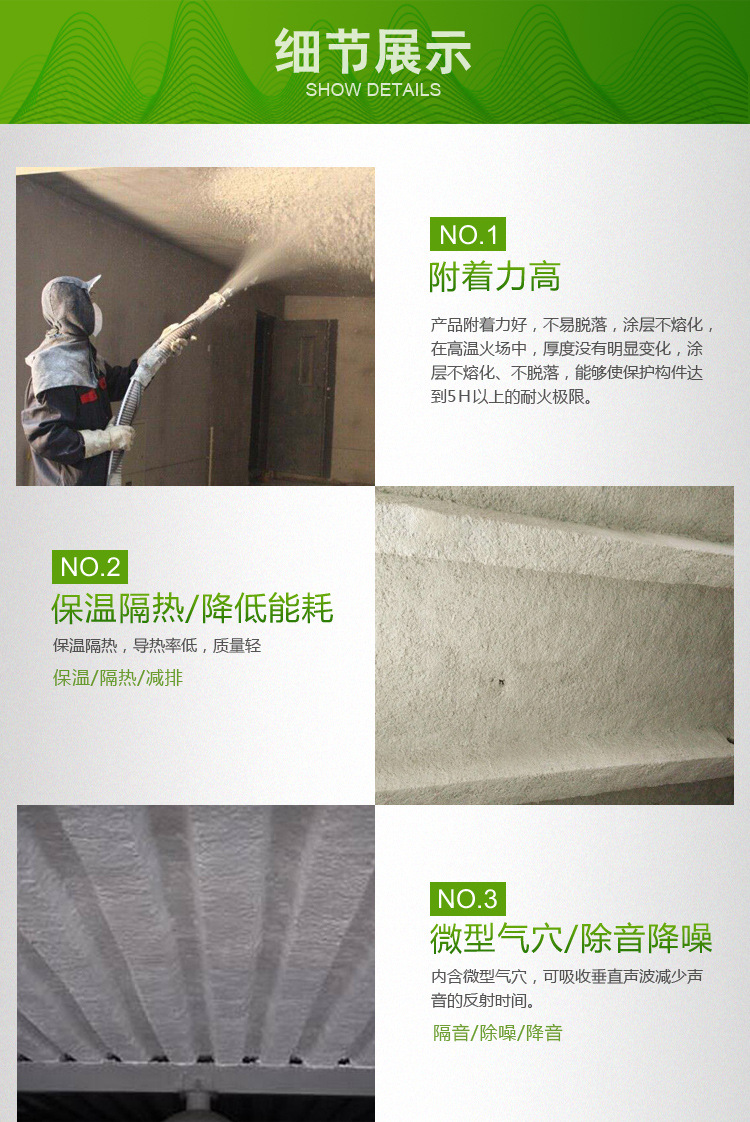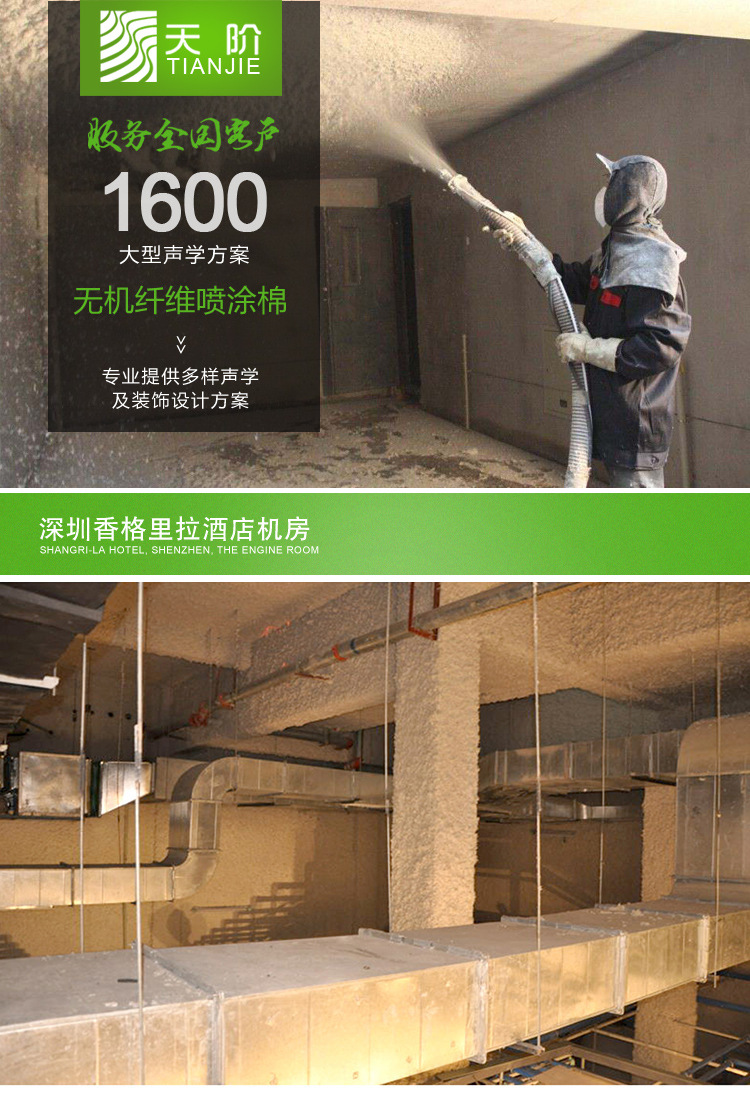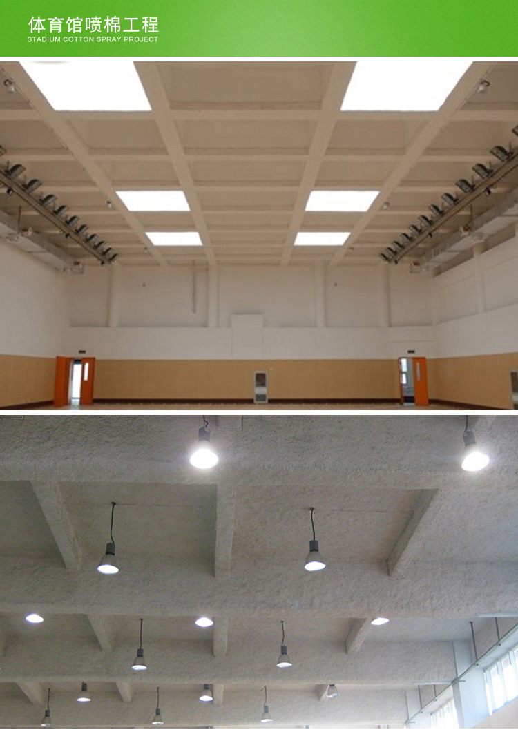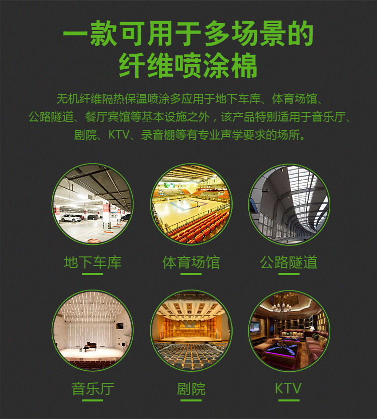 無機纖維隔熱保溫噴涂除能應用于地下車庫、體育場館、公路隧道、餐廳賓館等基本設施之外,該產品特別適用于音樂廳、劇院、KTV、錄音棚等有專業聲學要求的場所。