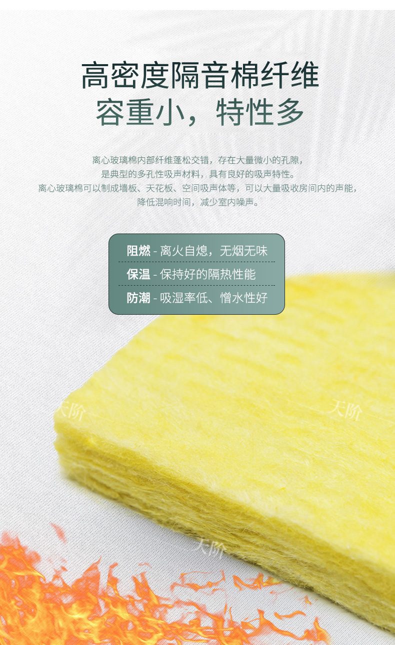 離心玻璃棉內部纖維蓬松交錯,存在大量微小的孔隙,是典型的多孔性吸聲材料,具有良好的吸聲特性。離心玻璃棉可以制成墻板、天花板、空間吸聲體等,可以大量吸收房間內的聲能,降低混響時間,減少室內噪聲。