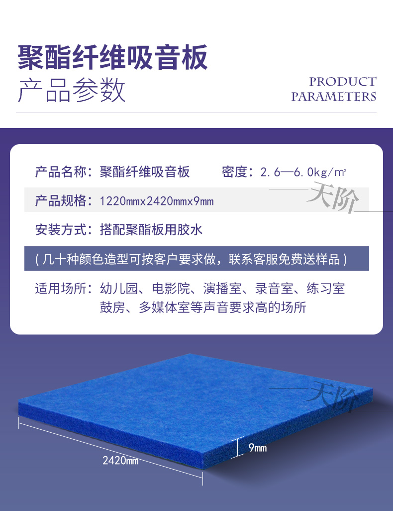 聚酯纖維吸音板又稱聚酯吸音板或纖維吸音板,是一種理想的吸聲裝飾材料。具有環保、阻燃、易除塵、易切割、可拼花、施工簡便、性價比優等特點,有多種花紋和顏色可供選擇,可滿足不同風格和層次的裝修要求。聚脂纖維吸音板在國內裝飾材料和聲學工程領域,應用非常廣泛,得到眾多國內**聲學專家的肯定與贊揚,并深受各界室內設計師、聲學設計師之信賴和選用,成為國內大部份城市的建筑聲學、產品降噪等工程的材料首選。
