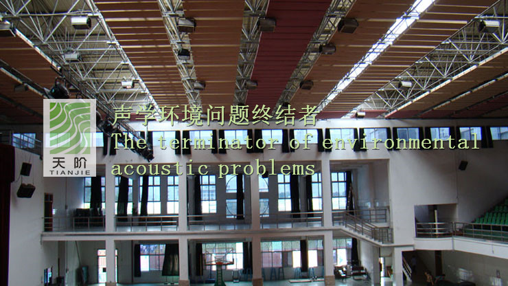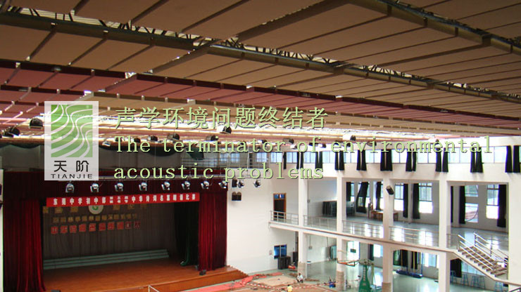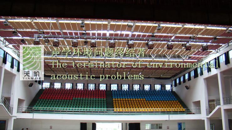 東莞中學(xué)體育館采用的是空間吸聲體??臻g吸聲體是一種懸掛在頂棚具有高效吸收性能的吸聲材料??臻g吸聲體一般水平或者垂直吊掛??臻g吸聲體面積占頂棚面積30%-40%時其材料的吸聲性能是其他聲學(xué)材料吸聲性能的2倍。