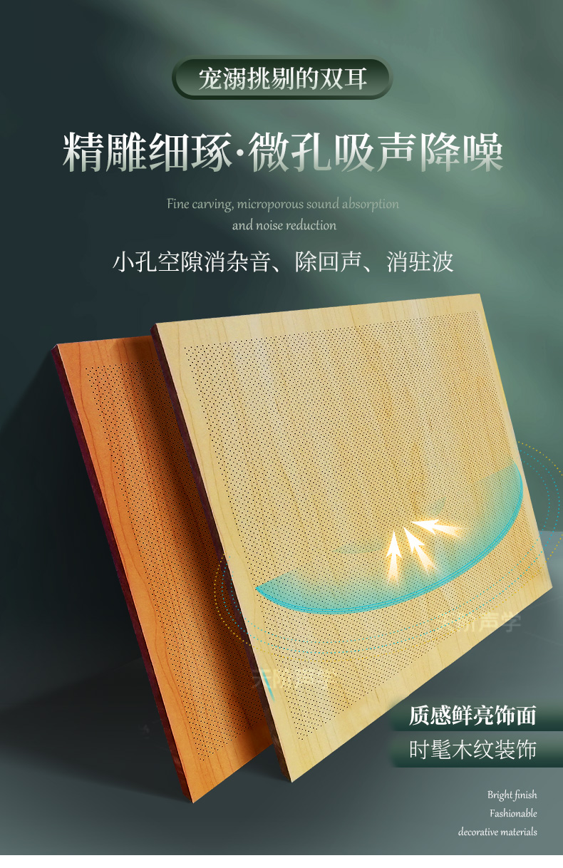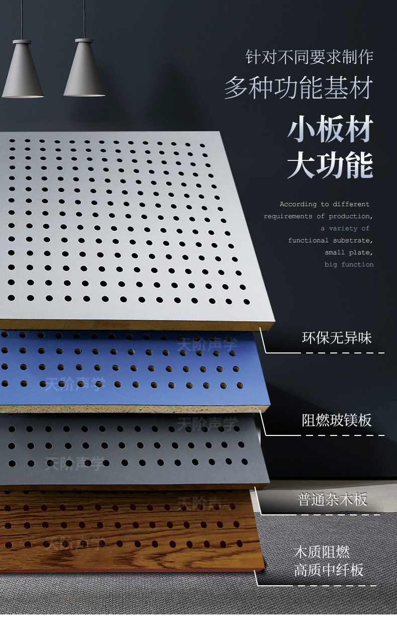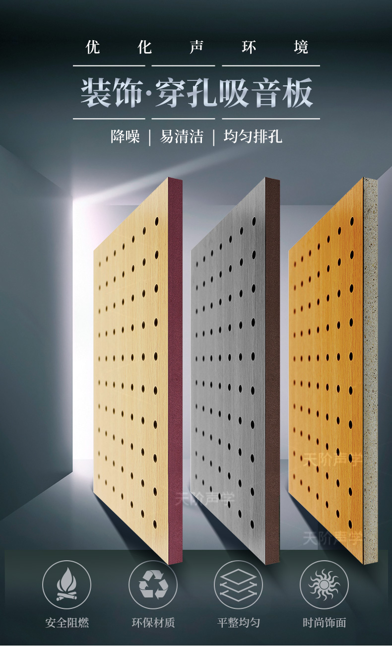 天階聲學(xué)孔木吸音板采用高質(zhì)的中纖板、具有環(huán)保、防火、防潮等性能,飾面顏色及材料選擇性廣,能很好地滿足客戶多樣化的聲學(xué)及裝飾需求。較槽木吸音板,孔木吸音板相對(duì)抗撞擊能力強(qiáng)。