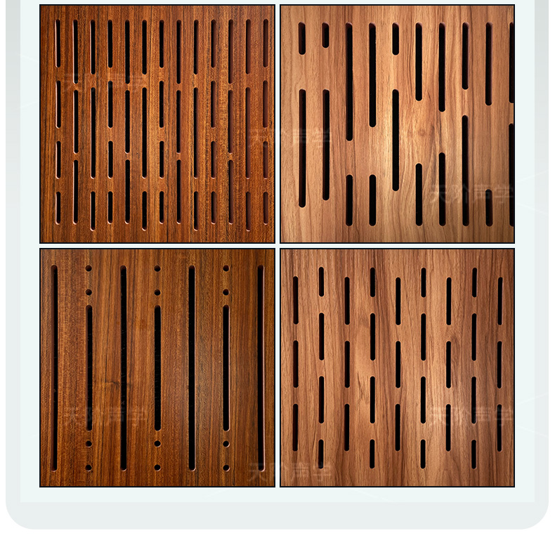孔木吸音板是一種在密度板上直接穿孔的共振吸聲材料。孔木吸音板對(duì)吸聲頻譜選擇性較強(qiáng),對(duì)低頻有很好的吸聲性能。如在吸聲結(jié)構(gòu)后空腔上填入適量的吸聲棉可提高中、高頻吸聲效果。