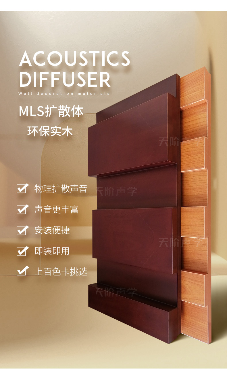 擴散是指聲音朝著許多方向不規則反射、折射和衍射的現象。擴散對“豐滿度”、“活躍度”、“空間感”是有利的,并且能保持豐滿和明晰度之間的平衡,語言清晰度和較長混響時間之間的平衡,還可以保持觀眾廳內音調的自然性。可以讓室內聲能分布均勻,清除回聲等。室內擴散不好,音色往往很粗糙。擴散體就是為改進聲場擴散性能所采用的布置,設計依據是利用不規則界面改變發射聲的波前,或者改變聲阻抗。